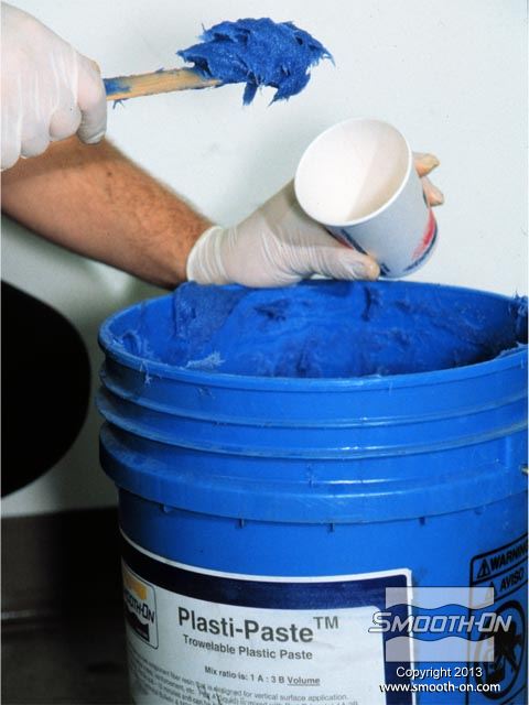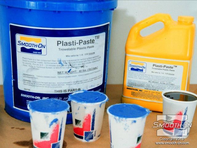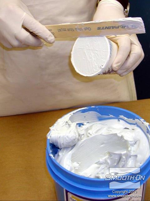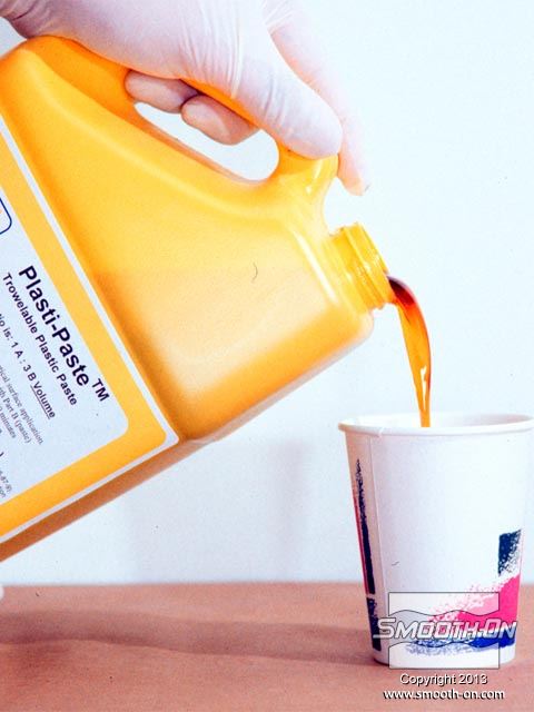 מודדים ומערבבים את הבסיס והמקשה של פוליאוריטן Plasti-Paste®. יחס הערבוב של החומר הוא 1A:3B לפי נפח. (הבסיס הוא נוזל והמקשה הוא משחה).