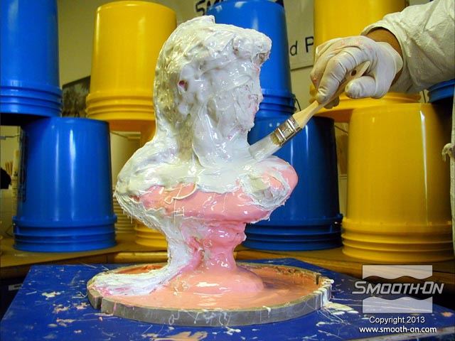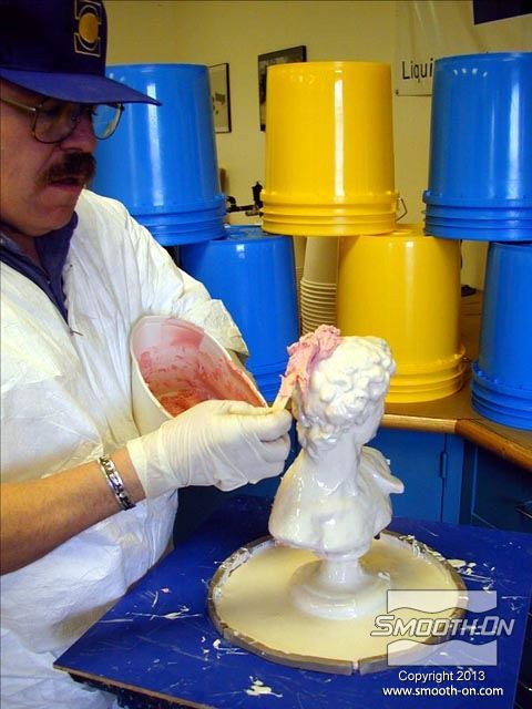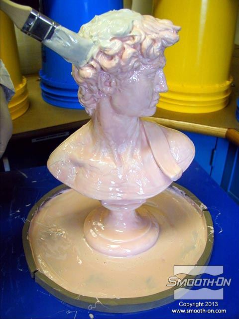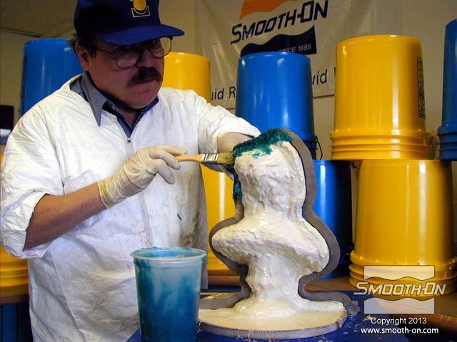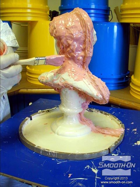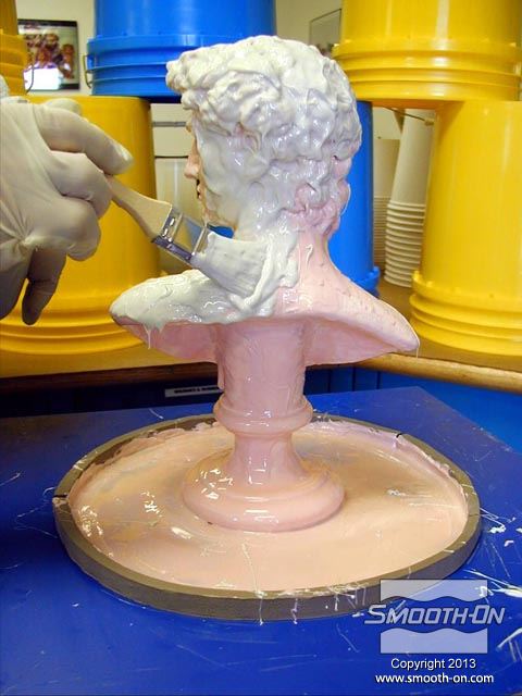 יציקה לתבנית גומי פוליאוריתן Brush-On. מרססים חומר הפרדה לתבניות על בסיס סיליקון בתוך חלל התבנית. מורחים גם חומר הפרדה על הצד החיצוני של תבנית ה גומי פוליאוריטן (למקרה שתהיה דליפה של חומר). ממקמים את חלקי התבנית חזרה לפי קו התפר.