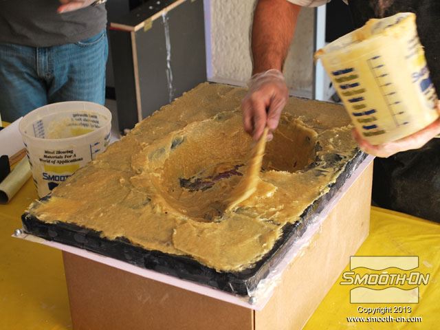 מורחים פולאוריטן מחוזק בסיבים PLASTI PASTE II על החימר לעיצוב בכדי ליצור את החלק הראשון של גיבוי התבנית.