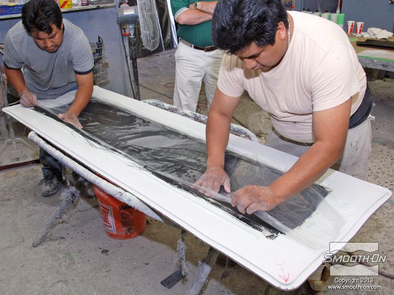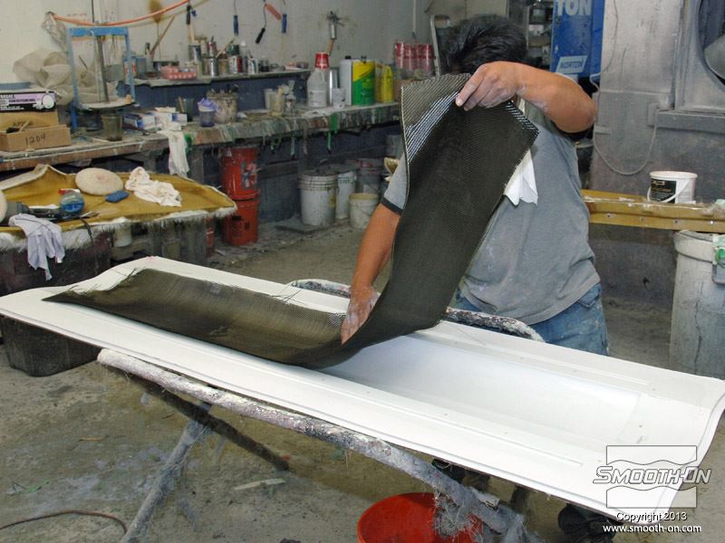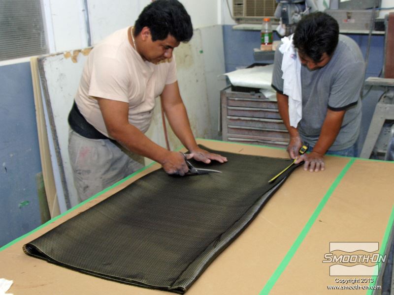 מניחים שכבות נוספות של בד קרבון בין השכבות מורחים שכבה נוספת של אפוקסי להספגה EpoxAmine בכל פעם.