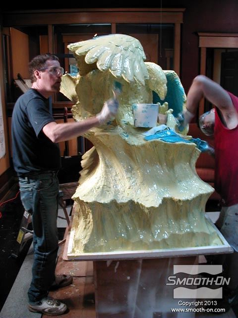 פסל העץ המקורי של דניס קולייר. מורחים שכבה ראשונה של סיליקון רך Mold Max® 10 להכנת תבנית. מכסים את כל שטח מודל העץ בשכבה דקה מאוד של סיליקון רך ליציקה Mold Max® 10. מבט נוסף על שכבת ה סיליקון Mold Max® 10  הראשונה. שכבה זו חשובה במיוחדת ונקראת מורחים שכבה שניה של סיליקון Mold Max® 10. צובעים שכבה זו בפיגמנט לסיליקון SilcPig כדי להבטיח כיסוי טוב. שכבת הסיליקון Mold Max® 10  השניה מוכנה. מורחים שכבה שלישית של סיליקון RTV לתבניות Mold Max® 10. מוסיפים לשכבה הרביעית של הסיליקון Mold Max® 10  פיגמנט לסיליקון SilcPig ומסמיך לסיליקון   Thi-Vex II. מורחים שכבה זו כדי להוסיף תמיכה לתבנית הסיליקון ולמלא זוויות שליליות (אנדרקאטים). לאחר שבונים לתבנית הסיליקון Mold Max® 10  את מעיל התמיכה (בעל מספר חלקים) מפוליאוריתן קשיח למריחה Plasti-Paste® II, ממקמים אותה במכונה ליציקה ברוטציה (Rotational Molding). מטים את התבנית במכונת הרוטציה כך שניתן יהיה יצוק אליה את שרף היציקה. שופכים שרף פוליאוריתן ליציקה ברוטציה  Smooth Cast Roto®. מורחים את הפוליאוריטן Smooth Cast 65D®  הנוזלי במברשת במקומות בהם קיימים פרטים עמוקים. מטים את התבנית במכונת רוטציה כך שהפוליאוריתן הנוזלי יגיע לכל האזורים בתבנית. חוזרים על התהליך מספר פעמים עד שמתקבלת מעטפת יציבה ועבה מספיק של פלסטיק (Skin) על גבי פנים התבנית. לאחר שפוליאוריתן ליציקה בסיבוב  Smooth Cast Roto®  מתמצק לחלוטין, מורידים את מעיל התמיכה. בתמונה זו, בה הסירו רק את חלקי מעיל התמיכה של חצי מתחתית המודל והחצאים העליונים של הכנפיים, ממחישה עד כמה תבנית זו מסובכת. מסירים את מעיל התמיכה מחצי אחד של ראש הנשר. מסירים את מעיל התמיכה מחצי ראש הנשר וחושפים את היציקה. היציקה העתיקה במדוייק את כל פרטי פסל העץ המקורי. מבט מקרוב על החצי השמאלי של ראש הנשר בתבנית סיליקון RTV   . תמונה זו ממחישה אילו פרטים קטנים מסוגל סיליקון Mold Max® 10 להעתיק. השוקעה מחשבה רבה בהכנת מעיל התמיכה. בנו אותו ממספר רב של חלקים כדי להתמודד עם אנדרקאטים ו'נעילה' של המעיל. בתמונה זו ניתן לראות את היציקה כשהיא בתוך תבנית הגומי סיליקון Mold-Max ומעיל התמיכה מפוליאוריתן Plasti-Paste II. כאן ניתן לראות את הפרטים שעל הכנף. אפילו התבנית של הכנף היא מעניינת! מבט על - בתמונה זו ניתן לראות איך החצי התחתון של הכנף מתחבר עם צד הנשר. במקרה זה היה צריך גם להכין מבט על פקק הסיליקון, לאחר שהסירו ממנו את מעיל התמיכה הפנימי שלו. יציקת הפוליאוריתן Smooth Cast® 65D הגמורה היא חלולה אך חזקה ושוקלת אחוז קטן ממה שהייתה שוקל יציקת ברונזה, גבס ואפילו פסל העץ המקורי. מבט מבקרוב על יציקת הפוליאוריתן הקשיח Smooth Cast® 65D. הלקוח שהזמין את העבודה הזמין גם גרסת ברונזה של הפסל. את מודל השעווה שעליו יצקו את הברונזה הכינו באותה תבנית. מבט מקרוב על יציקת הברונזה. ניתן לראות שהיציקה העתיקה את כל פרטי המודל המקורי.