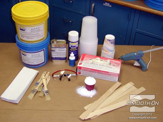 לפני תחילת העבודה מסדרים את כל החומרים והכלים שידרשו לתהליך: פוליאוריתן למריחה Brush-On® 40, חומר אטימהSuperSeal®, Universal® Mold Release, צבע So-Strong® כחול, ומסמיך URE FILL 11. כוסות ערבוב, כפפות, אקדח דבק חם, מגבות נייר, מברשות, משקפי מגן ומקלות ערבו