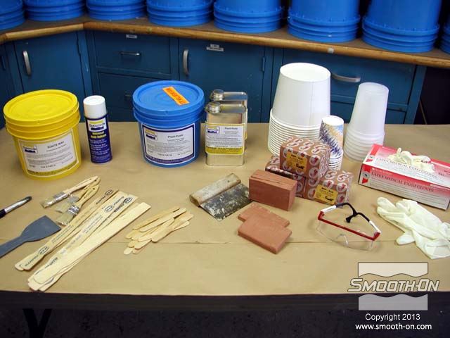 ביום שאחרי מכינים את מעיל התמיכה. ראשית מסדרים את כל החומרים והכלים עבור התהליך: פוליאוריתן קשיח למריחה מחוזק בסיבים Plasti-Paste, חומר אטימה Sonite® Wax, חומר הפרדה Universal® Mold Release וחימר LBT ללא גופרית. כוסות מדידה, כפפות, משקפי מגן, שפכטל ממתכת