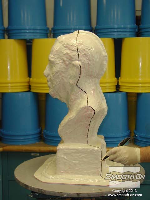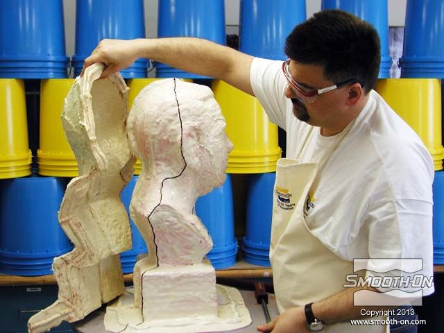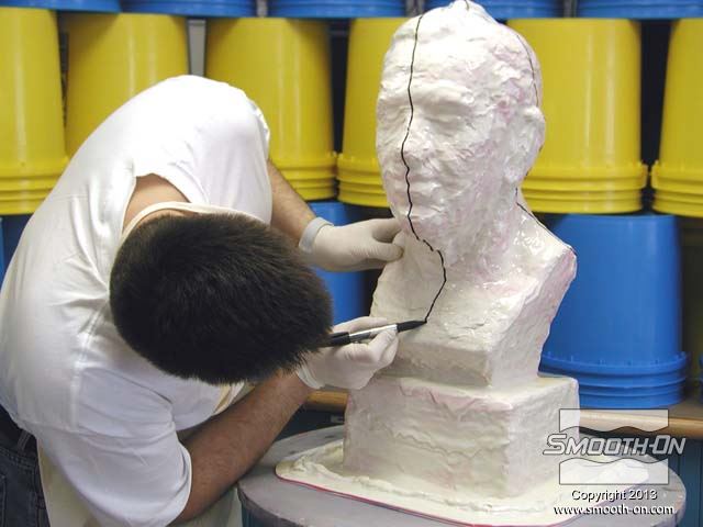 מתחילים לפסל את קו התפר של התבנית מלמעלה למטה. תפקידו של קו התפר הוא להקל על חתיכת התבנית לחלקיה השונים ועל נעילתם אחד עם השני.