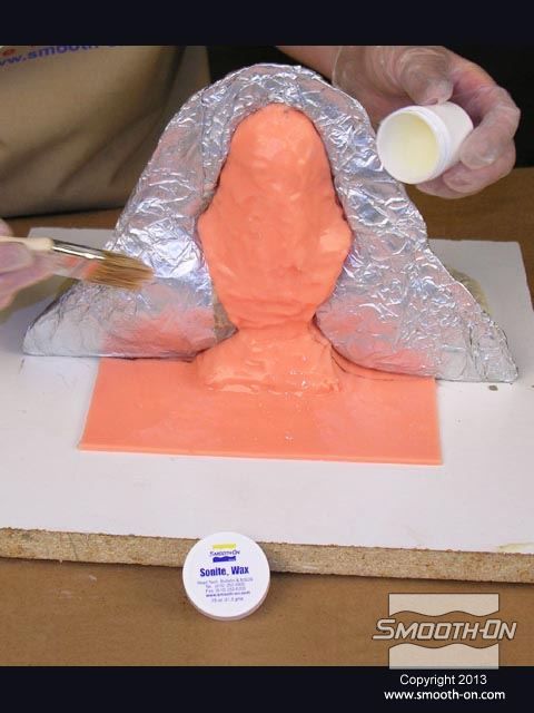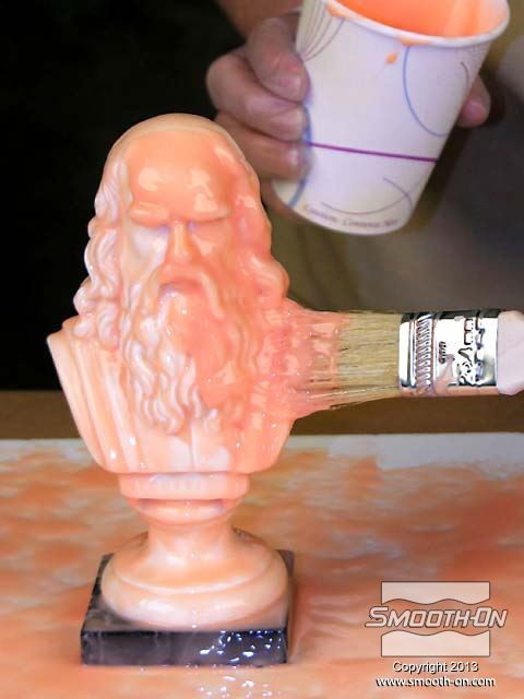 מכסים את כל המודל בשכבה הראשונה של סיליקון RTV למריחה Rebound® 25 . מורחים חומר גם על לוח הבסיס מסביב למודל במרחק של כ7.5 ס"מ כדי להקל על נעילת תבנית הסיליקון במעיל התמיכה בהמשך.