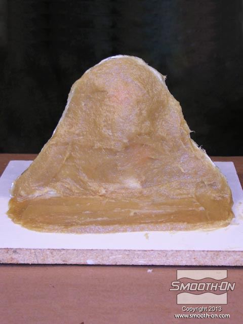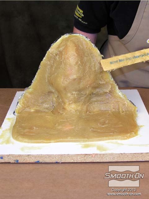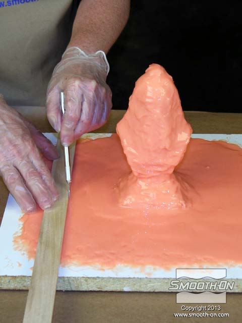 מורחים את הפוליאוריתן Plasti-Paste על כל שטח המודל, לוח הבסיס וקו התפר, בעובי של 1 ס"מ.