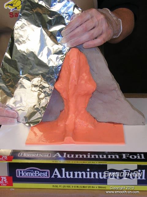נייר האלומיניום מפריד בין החימר לפוליאוריתן Plasti-Paste ויעזור בהפרדת שני חצאי מעיל התמיכה בהמשך.
