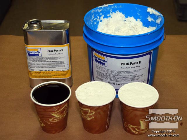 מודדים ומערבבים את הבסיס והמקשה של פוליאורתן Plasti-Paste ביחס ערבוב של 1A:3B.מורחים את הפוליאוריתן Plasti-Paste על כל שטח המודל, לוח הבסיס וקו התפר, בעובי של 1 ס"מ.