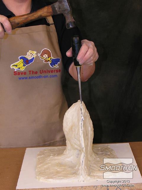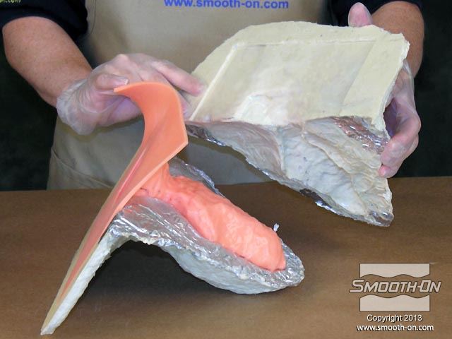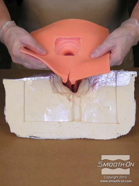 לאחר שהחומר מתמצק, מסירים את עודף נייר האלומינים. בעזרת פטיש ומברג, מפרידים בין שני חצאי מעיל התמיכה. פותחים את מעיל התמיכה בעדינות ומפרידים אותו מהמודל ומלוח הבסיס.