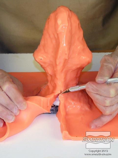 בעזרת סכין חד, חותכים בזהירות את תבנית הגומי סיליקון Rebound 25 לאורך קו התפר המעובה מלמטה למעלה.