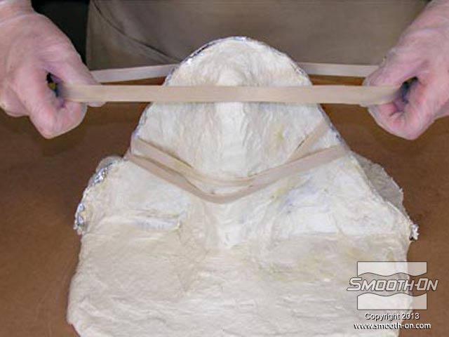 מאבטחים את התבנית ומעיל התמיכה בעזרת גומיות דואר. כעת התבנית מוכנה ליציקה.