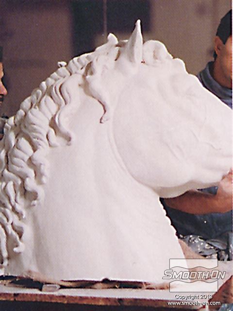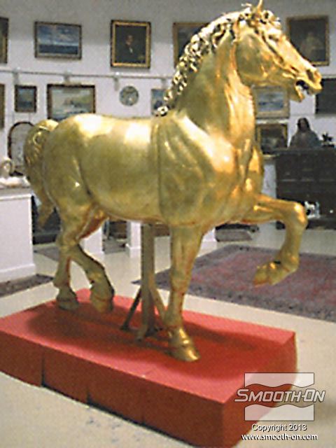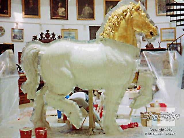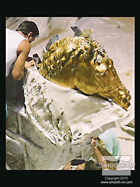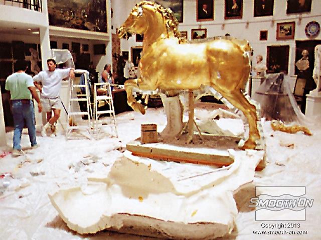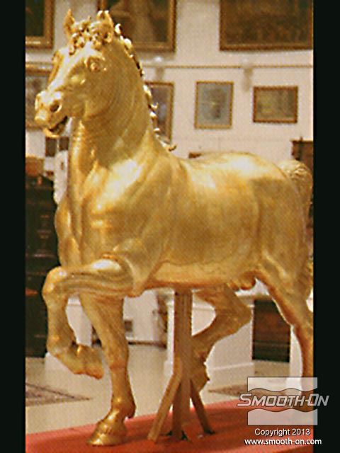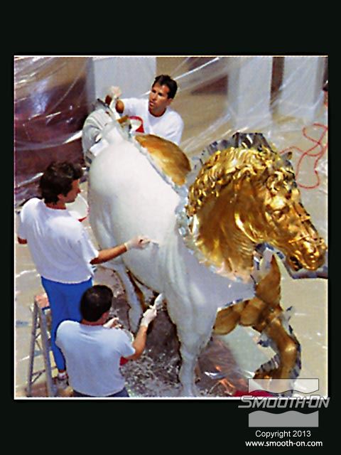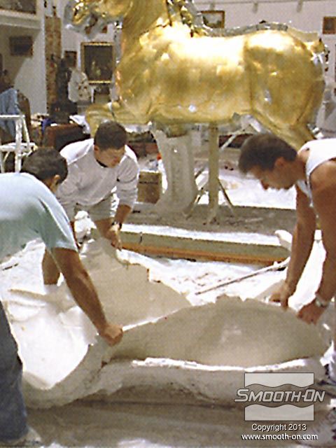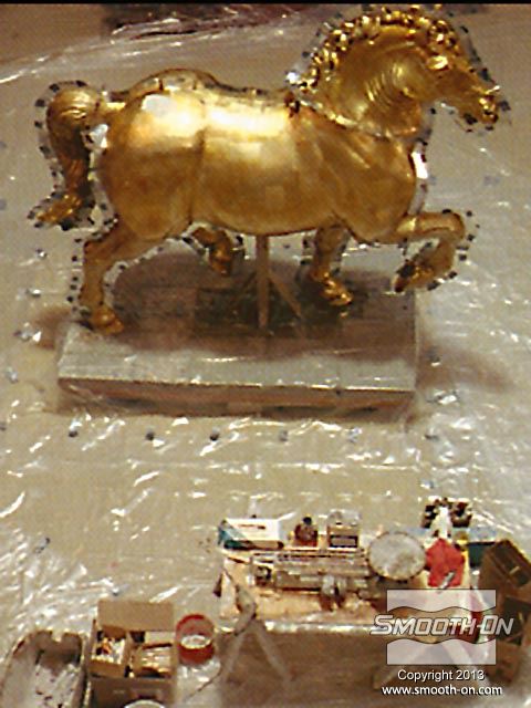 אמנים מחברת Clifton Sheely Co מתחילים את ההכנות להכנת תבנית. הם מכינים את מודל הסוס הזהוב לתהליך ע"י הכנת מחיצות לחלוקת המודל לאיזורים.