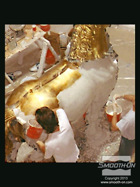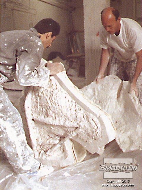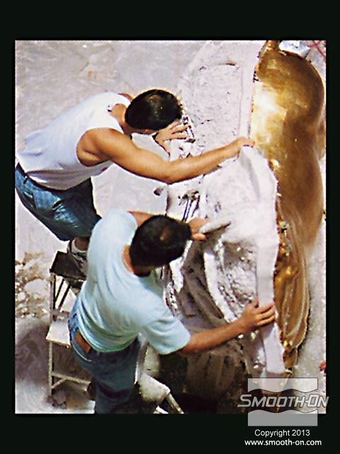 לאחר שתבנית הגומי מתמצקת לחלוטין, מכינים מעיל תמיכה מגבס בכמה שכבות. לאחר שמעיל התמיכה מהגבס מתמצק, מסירים אותו בחלקים שהוגדרו על פי המחיצות שהכינו מוקדם יותר.