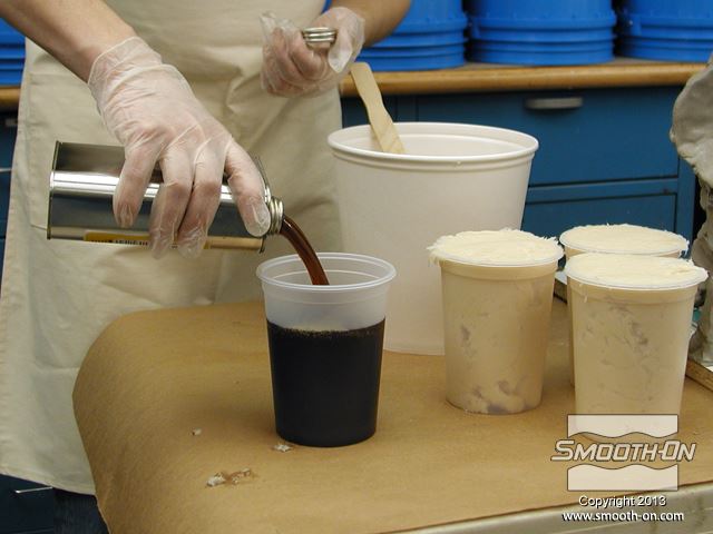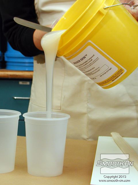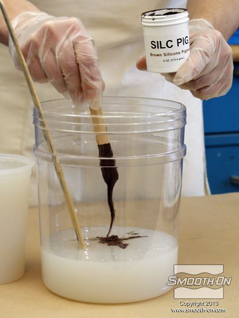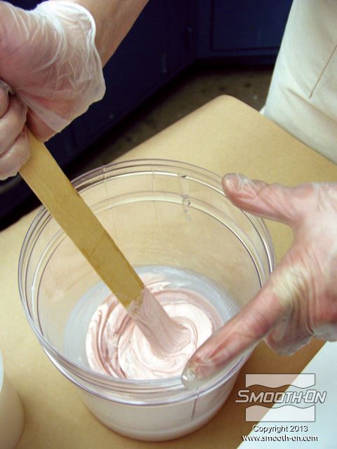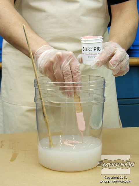 מודדים ומערבבים סיליקון לתבניות Dragon Skin® 10 FAST עם מסמיך Thi-Vex ופיגמנט Silc-Pig שונה, עבור השכבה השניה. משנים את צבע הסיליקון כדי להקל על כיסוי המודל בחומר.