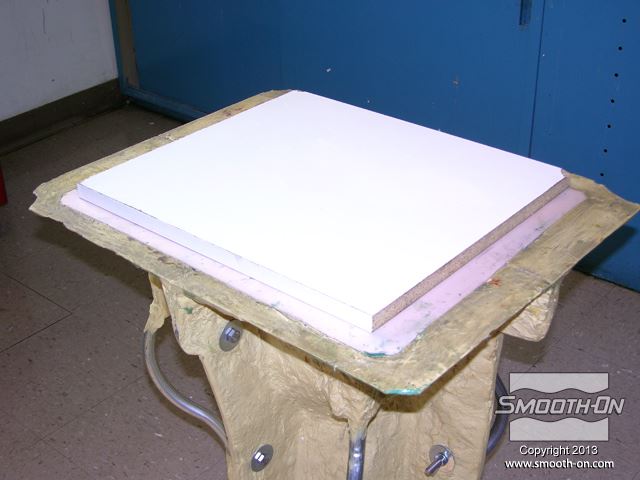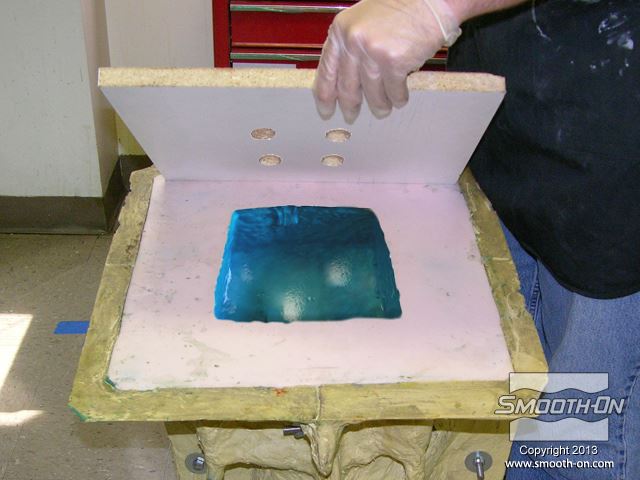 ממקמים את לוח הבסיס מעל מרכז חלל התבנית ולוחצים אותו כדי לספק לחץ נגדי לקצף העולה שעלול להזיז את המכסה ממקומו. במקרה שצפוי לחץ חזק במיוחד מומלץ לנעול את לוח המכסה בעזרת רצועות.