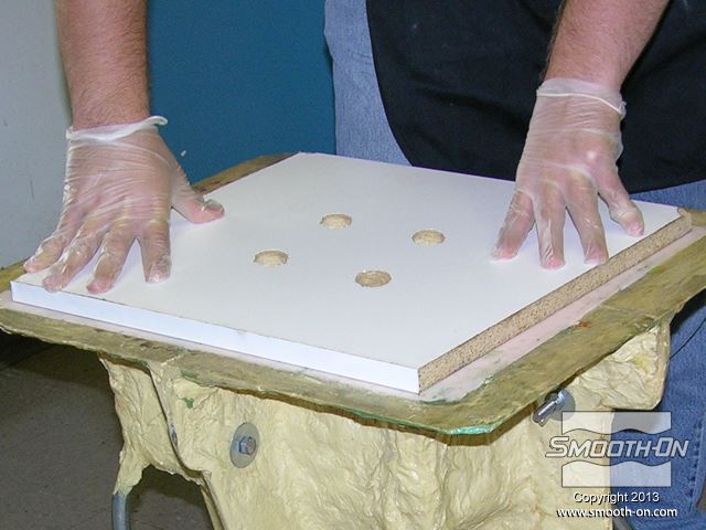 קודחים מעט חורים בלוח המכסה כדי לאפשר למעט חומר לצאת וכך לשחרר מעט את הלחץ. חשוב: מורחים שכבה נדיבה של חומר הפרדה על בסיס וקס נוזלי Ease Release® 2831 על לוח המכסה (גם לתוך החורים בו) כדי לאפשר את שחרור קצף הפוליאוריתן מלוח המלאמין.