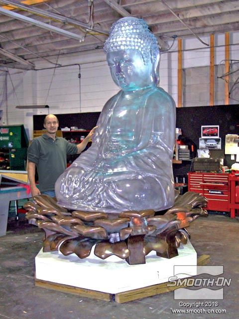 יציקות ה פוליאוריתן קשיח שקוף קריסטלי Crystal Clear מורכבות לגמרי. פסל הבודהה יושב על פרח לוטוס שהוכן ביציקת 'מתכת קרה' מפוליאוריתן קשיח Smooth-Cast.
