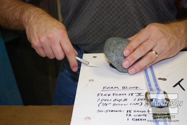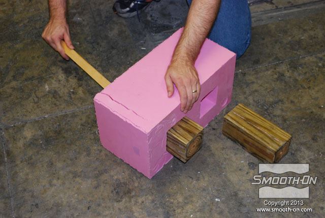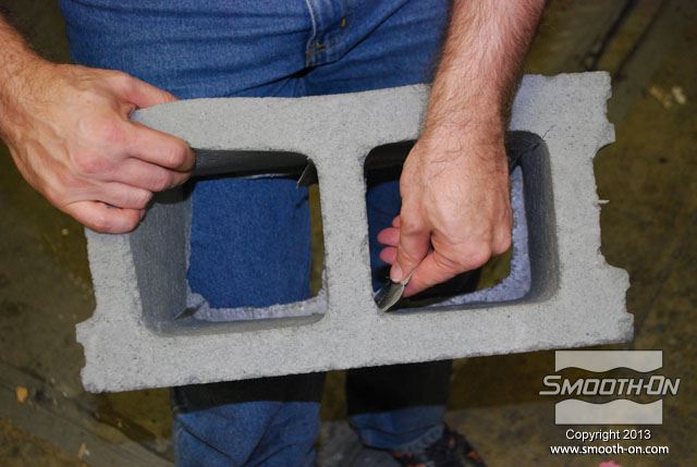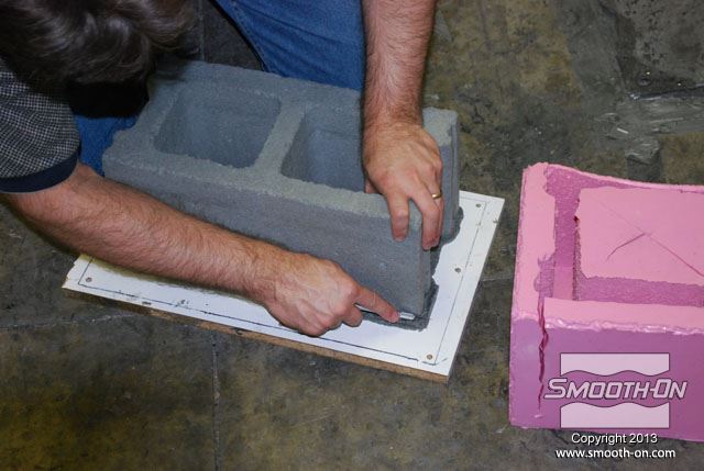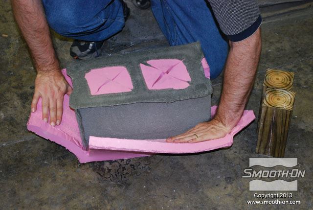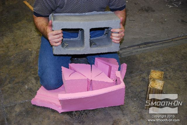 מכניסים את תבנית ה סיליקון ליציקה Mold Max 30 לתוך קופסת תבנית מעץ. בתוך תבנית הסיליקון קיימים מוטות תמיכה מעץ כך שהתבנית תשמור על צורתה בזמן היציקה. מכסה הקופסה מכיל חורים שיסייעו בשחרור הלחץ הנוצר בזמן התפשטות הקצף. מורחים על המכסה חומר הפרדה Sonite Wax, כדי למנוע מהקצף להדבק אליו. מורחים גם כל החורים במכסה חומר הפרדה Sonite Wax, כדי למנוע מהקצף להדבק. סוגרים את המכסה ומחזקים את הסגירה עם ראצ'טים. בשלב זה שמים כפפות ויניל כדי להגן על הידים. לפני שמודדים את חלק הבסיס של  ה פוליאוריתן גמיש מוקצף Flex Foam-iT! X מערבבים אותו היטב. לאחר הערבוב, מודדים את חלק הבסיס של ה פוליאוריתן מוקצף גמיש !Flex Foam-iT. מערבבים היטב גם את המקשה לפני שמודדים אותו. מודדים כמות שווה לפי נפח של המקשה. מוסיפים פיגמנט לפוליאוריתן So-Strong שחור למקשה של פוליאוריתן הFlex Foam-iT! X. מוסיפים גם פימנט So-Strong ירוק למקשה של פוליאוריטן מוקצף Flex Foam-iT! X . לבסוף, מוסיפים גם פיגמנט מרוכז לפוליאוריטן מסדרת So-Strong בצבע לבן למקשה של הפולאוריטן המוקצף Flex Foam-iT! X. מערבבים את המקשה עם הפיגמנטים השונים. שופכים את המקשה של קצף הFlex Foam-iT! X אל מיכל הערבוב. שופכים גם את הבסיס של קצף הFlex Foam-iT! X אל מיכל הערבוב. מערבבים בקפידה את שני המרכיבים. שופכים את תערובת ה פוליאוריטן מוקצף גמיש אל התבנית דרך החור במכסה. שופכים עוד מהקצף לחור בצד השני של המכסה. מניחים לקצף להתפשט אל מחוץ לקופסה ולהתמצק במשך שעה אחת. לאחר ההתמצקות חותכים את עודפי החומר שיצאו מחורי המכסה. מורידים את הראצ'טים. מורידים את מכסה קופסת התבנית. חותכים את שאריות החומר של תעלות כניסת החומר והאוורור שנשארו מהיציקה. היציקה מוכנה להוצאתה מהתבנית. הופכים את התבנית ומסירים את קופסת העץ מ תבנית הסיליקון. דוחפים את מוטות התמיכה מהעץ בעזרת מוט עץ נוסף. התבנית מוכנה לפתיחתה והוצאת היציקה. מקלפים את צידי התבנית מיציקת ה קצף פוליאוריתן. מוציאים את יציקת הפוליאוריטן הגמישה מתבנית הסיליקון. התקבלה יציקה מושלמת שדורשת מעט מאוד נקיונות. חותכים את הפלאשים הקיימים ביציקה בעזרת סכין חד. חותכים גם את הפלאשים בתחתית היציקה. מפזרים מעט טלק על פני היציקה כדי לתת לה מראה יותר אמיתי. היציקה מוכנה לשימוש. לבנים יצוקות אלו הן קלות מאוד ובטוחות לשימוש. לבנים אלו עמידות מאוד בזכות הגמישות והחוזק של פוליאוריתן מוקצף גמיש  הFlex Foam-iT! X. חוזרים על התהליך מספר פעמים לפי הצורך... ויוצרים קיר לבנים מדומות קל משקל!