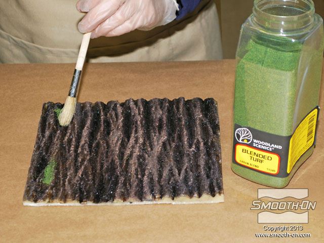 מוסיפים מעט דשא מעורבב עם דבק כדי לדמות מראה של טחב על קליפת העץ.