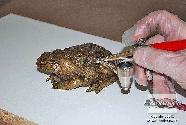 מכינים מראש את כל מה שצריך עבור הצביעה: צנצנות לערבוב, פיגמנטים לפוליאוריתן  So-Strong, מיכלי ערבוב ומקלות, מברשות, טרפנטין ומודל מפוליאוריתן גמיש ליציקה Vytaflex 30. מוציאים את יציקת הReoflex 30 מתבנית ה סיליקון ליציקה על בסיס פלטינום  Dragon skin 10. משתמשים בקרש מלאמין כלוח בסיס. מניחים את מודל הצפרדע על לוח המלאמין. מודדים את חלקי ה גומי פוליאוריתן למריחה Brush-On 40 ביחס ערבוב 1:1 לפי נפח. שופכים את המקשה של הBrush On 40 לתוך מיכל הערבוב. שופכים למיכל הערבוב גם את הבסיס של ה פוליאוריתן למריחה Brush On 40. מערבבים את החומרים ביסודיות. שופכים כמות קטנה של חומר מעורבב לכוס קטנה. מוסיפים לחומר בכוס הקטנה מעט פיגמנט חום. מערבבים את הפיגמנט עם החומר ביסודיות. מוסיפים כמות קטנה של טרפנטין כדי לדלל את גומי הפוליאורתן. מערבבים את המדלל ביסודיות בחומר. מורחים את החומר על כל המשטח החיצוני של המודל. מוודאים שמכסים את כל המשטחים במודל. מוודאים שמכסים את כל המשטחים במודל. משתמשים באקדח חם כדי להאיץ את התמצקות הפוליאוריתן Brush On 40. בזמן שזמן העבודה של החומר עוד לא חלף, מעבירים לכוס נוספת כמות קטנה של פוליאורתן Brush On מעורבב. מוסיפים לחומר בכוס הקטנה מעט פיגמנט ירוק. מוסיפים גם מעט פיגמנט שחור. מערבבים ביסודיות את החומר עם הפיגמנטים. מוסיפים בערך 5 חלקים של טרפנטין (בערך פי 5 מכמות החומר של הבסיס) כדי לדלל את החומר. מוסיפים מספיק טרפנטין עד שמתקבלת תערובת דלילה, בערך בצמיגות של חלב. שופכים את התערובת למברשת אוויר (Air Brush). צובעים את הפרטים הקטנים בעזרת מברשת האוויר גומי הפוליאוריתן המדולל זורם בקלות דרך מברשת האוויר. פרטי העור גמורים! לבסוף, צובעים את העיניים בעזרת אותה תערובת של פוליאוריתן Brush On 40 בעזרת מברשת. מניחים לצבע להתמצק במשך לילה. לאחר התמצקות הצבע היצירה גמורה. הצפרדע נראית מציאותית מאוד וצבע שנעשה בשיטה זו הינו עמיד ביותר!