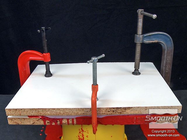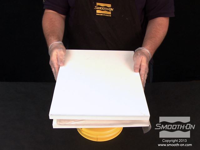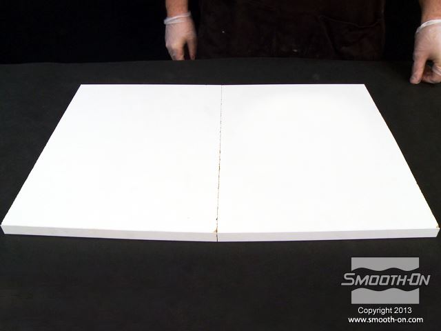 לחיצה להגדלת תמונה לאחר שהפוליאוריטן Smooth-Cast® 60D מתמצק לחלוטין, מסירים את המלחציים ומעבירים את הלוחות עם התבנית לשולחן עבודה שטוח. לאחר שהפוליאוריטן Smooth-Cast® 60D מתמצק לחלוטין, מסירים את המלחציים ומעבירים את הלוחות עם התבנית לשולחן עבודה שטוח.