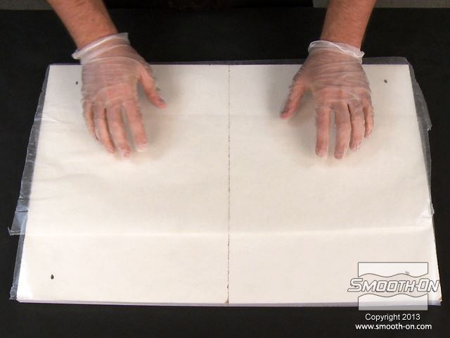 לחיצה להגדלת תמונה מניחים שני לוחות אחד לצד השני ליצירת משטח עבודה אחד. משטח העבודה ישמש כדי להכין תבנית  מ בצק סיליקון Equinox® 40 עם ציר. מניחים שני לוחות אחד לצד השני ליצירת משטח עבודה אחד. משטח העבודה ישמש כדי להכין תבנית מ בצק סיליקון Equinox® 40 עם ציר.