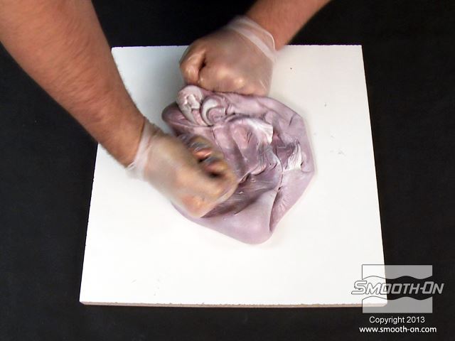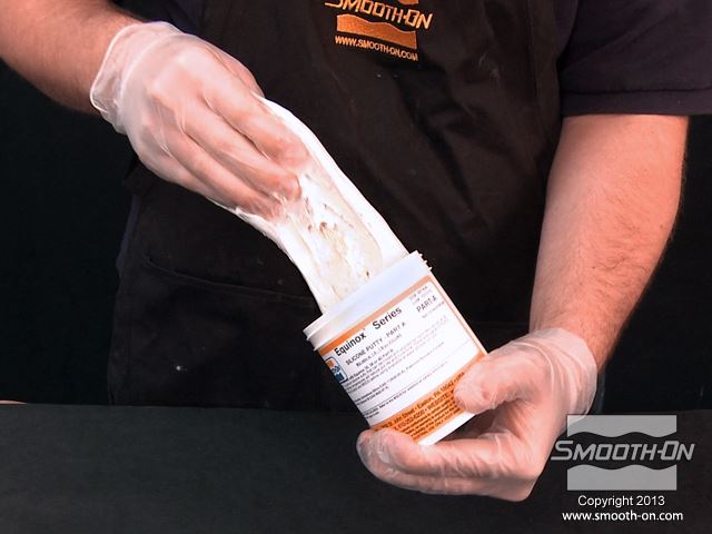 לחיצה להגדלת תמונה כדי להכין את התבנית משתמשים בבצק סיליקון Equinox® 40. יחס הערבוב של החומר הוא 1:1 לפי נפח. מכינים שתי מנות בנפח שווה של בצק סיליקון. משלבים את שתי חתיכות בצק הסיליקון על הלוח כך שיווצר משטח אחיד שיכסה את כל משטח העבודה. כדי להכין את התבנית משתמשים בבצק סיליקון Equinox® 40. יחס הערבוב של החומר הוא 1:1 לפי נפח. מכינים שתי מנות בנפח שווה של בצק סיליקון. משלבים את שתי חתיכות בצק הסיליקון על הלוח כך שיווצר משטח אחיד שיכסה את כל משטח העבודה.