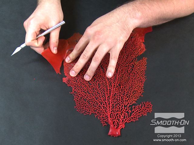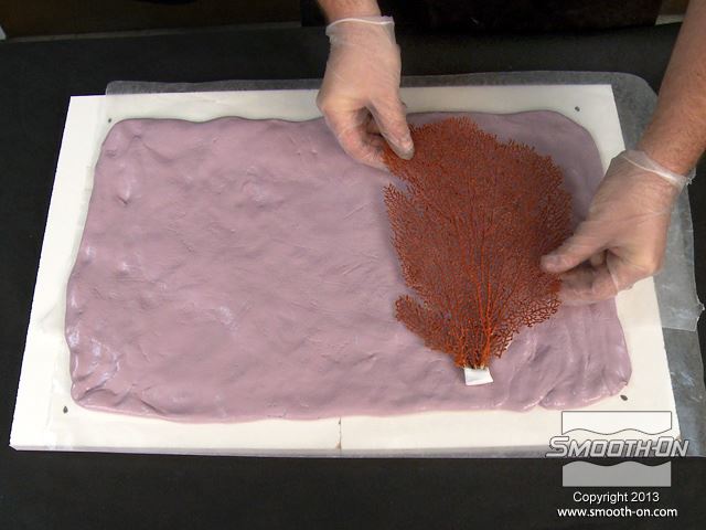 המודל המקורי הוא מניפת ים יבשה עם פרטים מורכבים ועדינים. מידותיה הם 28 ס"מ (גובה) על 18 ס"מ (רוחב). מפעילים לחץ על בצק הסיליקון מהמרכז החוצה ומפזרים את הבצק על כל הלוח, עד לנקודות הגבול שסימנו מוקדם יותר. המטרה היא ליצור כיסוי אחיד של לוח הבסיס בעובי של כ1 ס מבט צד על מניפת הים המיובשת. עובי המודל הוא מאוד דק (~ 1 מ מניחים שני לוחות אחד לצד השני ליצירת משטח עבודה אחד. משטח העבודה ישמש כדי להכין תבנית  מ בצק סיליקון Equinox® 40 עם ציר. מניחים את המודל במרכז הלוח הימני ומסמנים 2 נקודות, על הפינות החיצוניות של חצי הלוח, כדי לסמן את גבול תבנית הסיליקון Equinox® 40. כעת מניחים את המודל במרכז הלוח השמאלי ומסמנים בשתי נקודות נוספות בפינות החיצוניות של חצי הלוח. בגלל שלמניפת הים יש פרטים מאוד קטנים ועדינים, מרססים חומר הפרדה בין סיליקון לסיליקון Ease Release 200 על שני צידי המודל ומכסים אותו לגמרי בחומר.  כך מבטיחים שתבנית הסיליקון Equinox® 40 תרד בקלות מהמודל. מניחים על הלוחות נייר שעווה כדי להקל על העבודה עם בצק הסיליקון Equinox® 40. כדי להכין את התבנית משתמשים בבצק סיליקון Equinox® 40. יחס הערבוב של החומר הוא 1:1 לפי נפח. מכינים שתי מנות בנפח שווה של בצק סיליקון. משלבים את שתי חתיכות בצק הסיליקון על הלוח כך שיווצר משטח אחיד שיכסה את כל משטח העבודה. מודדים את הבסיס של בצק סיליקון לתבניות Equinox® 40. מודדים את המקשה של בצק סיליקון Equinox® 40. מערבבים את הבסיס והמקשה של בצק הסיליקון Equinox® 40. זמן העבודה של החומר הוא 30 דקות. ממשיכים לערבב את הבסיס והמקשה עד שהבצק בצבע אחיד ואין בו קווים של צבע. לאחר שהמנה מוכנה שמים אותה במיכל נקי ומכינים מנה נוספת, זהה בנפח לראשונה. מניחים את שתי מנות בצק הסיליקון Equinox® 40, שהוכנו בנפרד, על לוח הבסיס. שתי מנות בצק הסיליקון Equinox® 40 מוכנות לערבוב אחת עם השניה. משלבים את שתי מנות הבצק למנה אחת גדולה. לשים את בצק הסיליקון Equinox® 40 על לוח הבסיס עד ששתי המנות מעורבבות טוב אחת בשניה. בצק הסיליקון Equinox® 40 מכסה באופן אחיד את לוח הבסיס המכוסה בנייר שעווה. מרססים חומר הפרדה Ease Release 200 על כל משטח בצק הסיליקון Equinox® 40 כדי למנוע ממנו להידבק לעצמו. מניחים את מודל מניפת הים המקורי על חצי הלוח הימני של תבנית בצק הסיליקון Equinox® 40. לוחצים בעדינות אך בכוח מספיק את המודל, עד שכחצי ממנו מוטבע בבצק הסיליקון Equinox® 40. מקפלים את תבנית בצק הסיליקון Equinox® 40 על המודל בעזרת נייר השעווה. משתדלים לקפל את התבנית כמה שיותר במרכזה. המטרה היא לעטוף בעדינות את המודל בתוך תבנית הסיליקון Equinox® 40 המקופלת. לוחצים בעדינות על אזור קו התפר של התבנית כדי ליצור עובי אחיד. נזהרים לא ללחוץ על המודל המקורי שבתוך התבנית. משאירים את התבנית עם המודל המקורי על חצי לוח אחד ומגביהים את הלוח ותבנית הסיליקון Equinox® 40 מספיק כדי שיהיה אפשר לתפוס את פינות הלוח במלחציים בהמשך. סוגרים את התבנית בחצי הלוח השני וכעת אפשר לסגור את שני החצאים בעזרת מלחציים. ממקמים שלושה מלחצי C במרחקים שווים ממרכז הלוחות. בשלב זה עדיין לא מהדקים אותם. מהדקים את המלחציים עד שמגיעים ללחץ אחיד על המשטח. מניחים לתבנית בצק הסיליקון Equinox® 40 להתמצק לגמרי (לפחות 5 שעות). לאחר שבצק הסיליקון Equinox® 40 התמצק לגמרי, מסירים את שלושת המלחציים. חותכים בסכין חד את עודף בצק הסיליקון Equinox® 40 שיוצא מקצוות הלוחות. ממקמים את כל המבנה על שולחן עבודה. פותחים את הלוחות וחושפים את תבנית הציר מבצק הסיליקון Equinox® 40. מסירים את נייר השעווה מתבנית בצק הסיליקון Equinox® 40. מפרידים את שני חצאי תבנית הסיליקון Equinox® 40 בקילוף וחושפים את המודל המקורי. לאחר ששני חצאי תבנית הציר מופרדים, אפשר לראות שתבנית ה בצק סיליקון Equinox® 40 העתיקה במדוייק את כל הפרטים המורכבים של המודל המקורי. מבט מקרוב על תבנית בצק סיליקון Equinox® 40. חתיכות קטנות מהמודל המקורי שנשארו בתבנית ניתנות להסרה בקלות. יציקה - משתמשים בפוליאוריתן חצי גמיש יצי קשיח Smooth-Cast® 60D. יחס הער