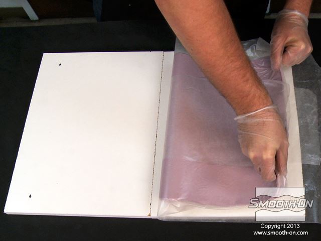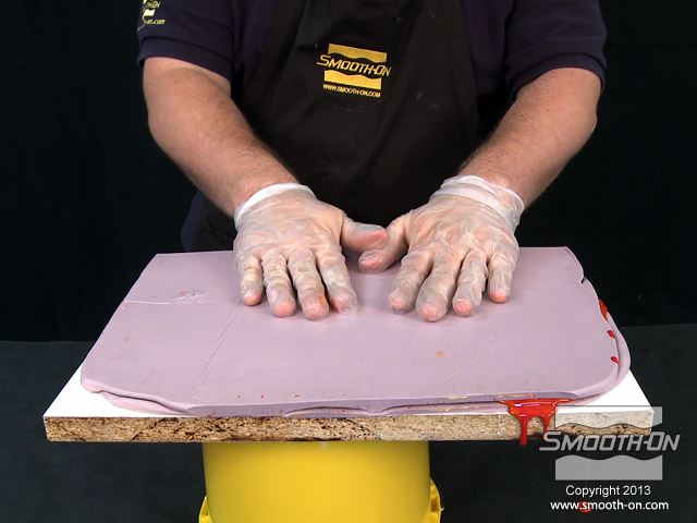 לחיצה להגדלת תמונה מגביהים את לוח הבסיס ותבנית בצק הסיליקון ויוצקים את תערובת הפוליאוריתן Smooth-Cast® 60D לשני חצאי התבנית. מגביהים את לוח הבסיס ותבנית בצק הסיליקון ויוצקים את תערובת הפוליאוריתן Smooth-Cast® 60D לשני חצאי התבנית.