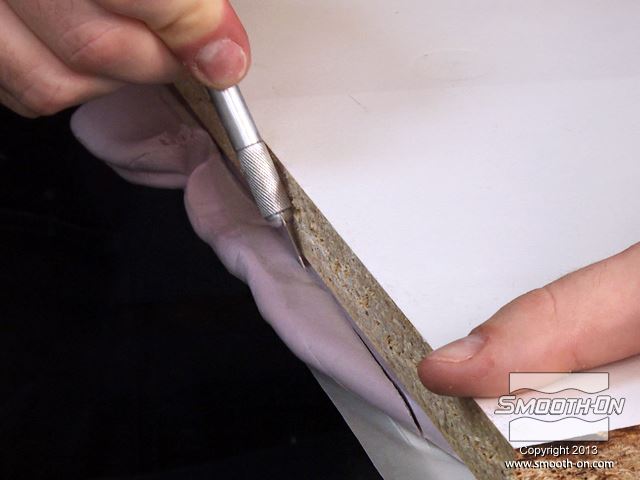 לחיצה להגדלת תמונה חותכים בסכין חד את עודף בצק הסיליקון Equinox® 40 שיוצא מקצוות הלוחות. חותכים בסכין חד את עודף בצק הסיליקון Equinox® 40 שיוצא מקצוות הלוחות.