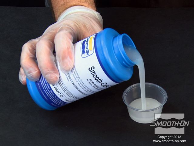 לחיצה להגדלת תמונה מוסיפים למקשה האדום לבן את בסיס הפוליאוריתן Smooth-Cast® 60D ומערבבים ביסודיות. מוסיפים למקשה האדום לבן את בסיס הפוליאוריתן Smooth-Cast® 60D ומערבבים ביסודיות.
