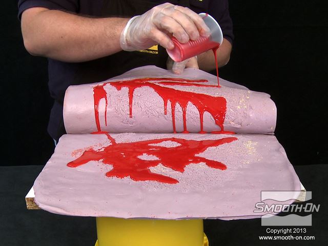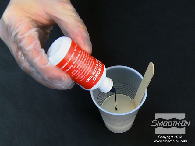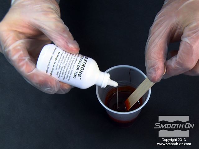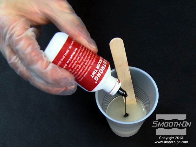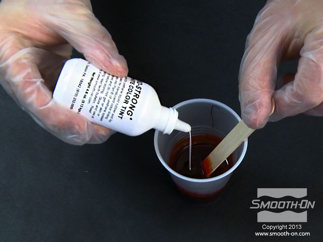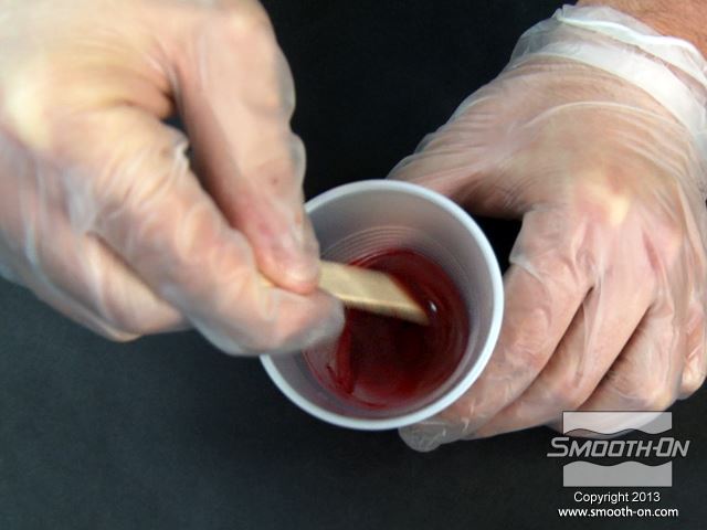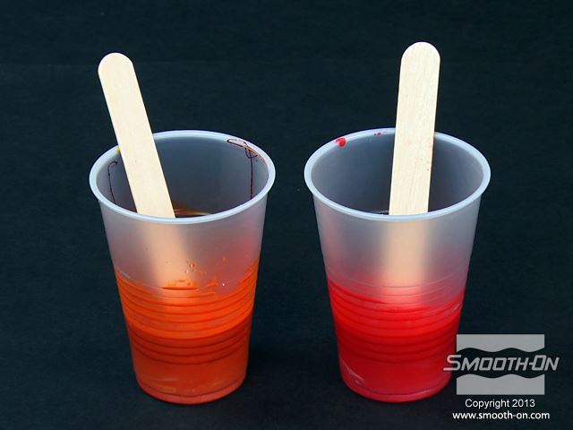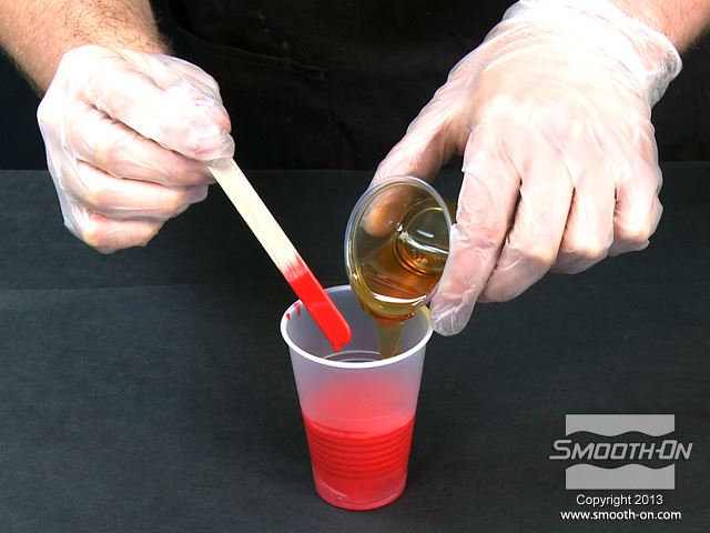 לחיצה להגדלת תמונה מעבירים את המקשה של הפוליאוריטן ליציקה Smooth-Cast® 60D למיכל ערבוב גדול יותר ומוסיפים לו מספר טיפות של פיגמנט SO-Strong אדום. מעבירים את המקשה של הפוליאוריטן ליציקה Smooth-Cast® 60D למיכל ערבוב גדול יותר ומוסיפים לו מספר טיפות של פיגמנט SO-Strong אדום.