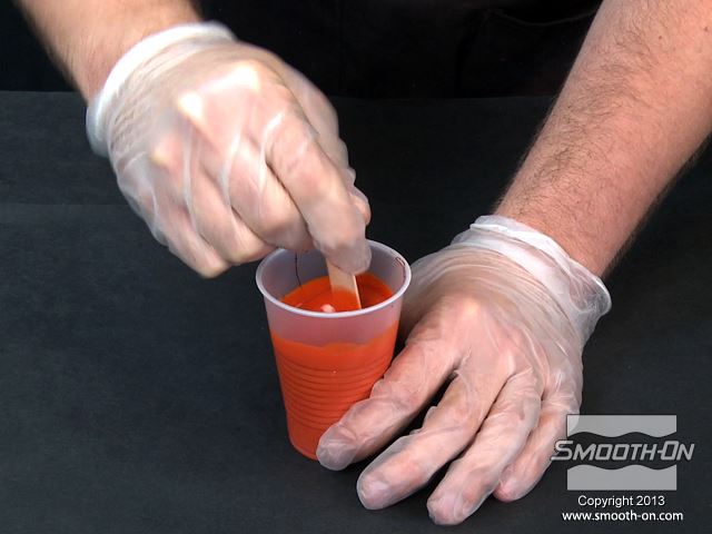 לחיצה להגדלת תמונה מוסיפים למקשה האדום לבן את בסיס הפוליאוריתן Smooth-Cast® 60D ומערבבים ביסודיות.  זמן העבודה של החומר הוא קצר יחסית ולכן יש לעבוד בזריזות. מוסיפים למקשה האדום לבן את בסיס הפוליאוריתן Smooth-Cast® 60D ומערבבים ביסודיות. זמן העבודה של החומר הוא קצר יחסית ולכן יש לעבוד בזריזות.