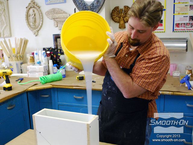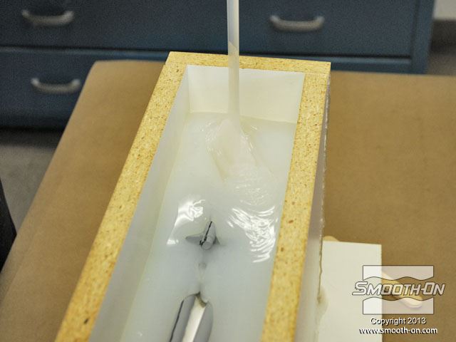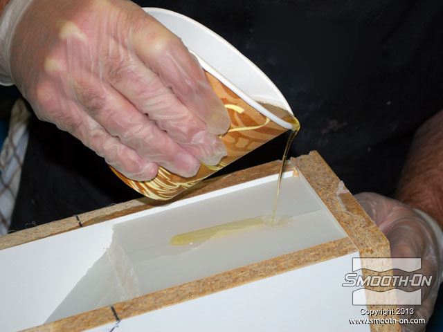 שופכים את סיליקון Mold Max 15T אל תוך קופסת התבנית באיטיות.