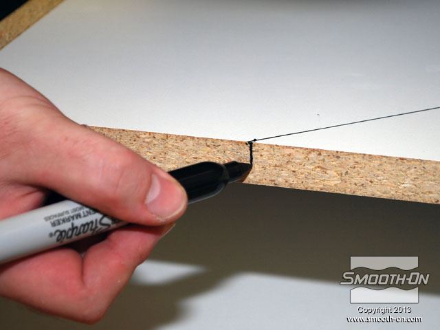 מציירים את ההיטל של הקו גם על לוח הבסיס. הקו ישמש כסימון להיכן יש לחתוך את התבנית כדי לחלוץ את המודל בהמשך.