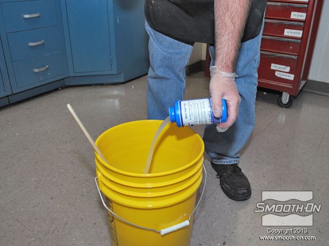 שופכים למיכל הערבוב את חלק הבסיס של סיליקון שקוף למחצה Mold Max 15T.