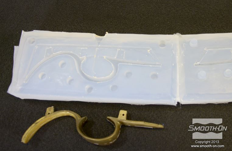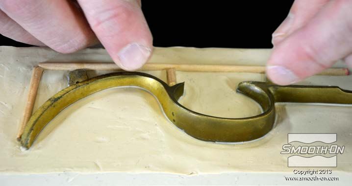 המודל המקורי הוא בית הדק מפליז של אקדח ישן. מטביעים את המודל עד האמצע במיטת חימר הטול גופרית.. בעזרת קיסמי עץ, יוצרים תעלות אוורור באזורי התבנית שעלולים לכלוא אוויר ביציקה. מטביעים בחימר מעצבים גם משפך המתאים להזרקת שעווה. בונים מסגרת לתבנית בעזרת לוחות קצף. מדביקים את הלוחות מסביב למיטת החימר בדבק חם. מטביעים מפתחות נעילה במיטת החימר בעזרת כלי מתאים. מסגרת התבנית מוכנה ליציקת חצי התבנית הראשון. מכינים את התבנית בעזרת סיליקון שקוף למחצה ליציקה SORTA-Clear® 37. יחס הערבוב של סיליקון שקוף SORTA-Clear® 37 הוא 1:1 לפי נפח. עושים ערבוב כפול ל סיליקון ליציקה SORTA-Clear® 37  כדי להבטיח שהמרכיבים מעורבבים היטב. בזמן הערבוב יש לגרד את צידי ותחתית הכלי מספר פעמים כדי להבטיח ערבוב טוב. לאחר הערבוב, מכניסים את ה סיליקון השקוף SORTA-Clear® 37  לתא ואקום. תא הווקום צריך להיות מסוגל למשוך לחץ של 29 אינצ' כספית. כעת אפשר ליצוק את הסיליקון SORTA-Clear® 37  אל מסגרת התבנית. משתמשים ב סיליקון RTV לתבניות SORTA-Clear® 37 במקרה זה, כי חשוב לראות את השעווה בזמן שהיא מוזרקת אל התבנית. לאחר שהסיליקון SORTA-Clear® 37  התמצק, הופכים את התבנית ומסירים את החימר. לאחר שהתבנית נקיה מחימר, מודדים חומר הפרדה Ease Release 205 בכוס. מורחים חומר הפרדה לתבניות סיליקון Ease Release® 205 כדי למנוע מחצי התבנית החדש להדבק לחצי המוכן. מחכים כמה דקות שהחומר יתייבש ומורחים שכבה נוספת ומחכים שגם היא תתייבש. מערבבים מנה נוספת של סיליקון שקוף למחצה SORTA-Clear® 37 ויוצקים לתבנית. לאחר שהסיליקון SORTA-Clear® 37 מתמצק, מסירים את מסגרת התבנית. חותכים את התבנית ופותחים אותה. חולצים את המודל המקורי ואת מקלות העץ. כעת תבנית ה2 חלקים מוכנה להזרקת השעווה והעתיקה את פרטי המודל המקורי במדוייק. כדי לסגור את התבנית בחוזקה אך מבלי לפגוע בה, שמים שתי חתיכות קרטון על צידי התבנית ומהדקים בעזרת גומיות. מזריקים את השעווה לתבנית. ניתן לראות את השעווה דרך התבנית סיליקון שקוף למחצה SORTA-Clear® 37. לאחר שהשעווה מתמצקת חושפים את היציקה. ניתן לראות כי היציקה היא העתק מושלם של המודל המקורי. יוצרים מספר רב של יציקות שעווה ולאחר מכן מורידים מהם את הגראדים. יציקות השעווה מוכנות לתהליך היציקה של שעווה נעלמת. בתהליך זה ניתן ליצוק כסף, זהב, פליז וברונזה.