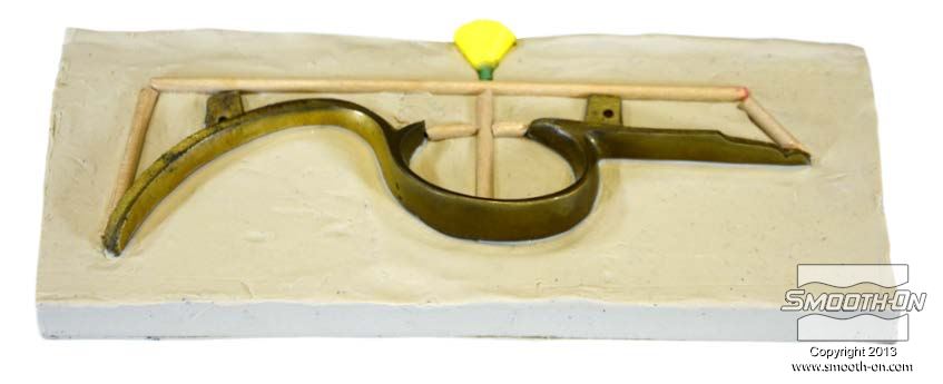 לחיצה להגדלת תמונה המודל המקורי הוא בית הדק מפליז של אקדח ישן. מטביעים את המודל עד האמצע במיטת חימר הטול גופרית.. המודל המקורי הוא בית הדק מפליז של אקדח ישן. מטביעים את המודל עד האמצע במיטת חימר הטול גופרית..