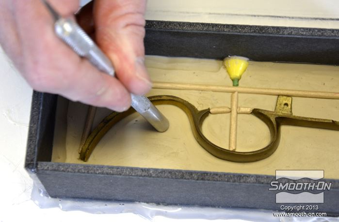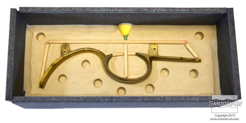 לחיצה להגדלת תמונה בעזרת קיסמי עץ, יוצרים תעלות אוורור באזורי התבנית שעלולים לכלוא אוויר ביציקה. בעזרת קיסמי עץ, יוצרים תעלות אוורור באזורי התבנית שעלולים לכלוא אוויר ביציקה.