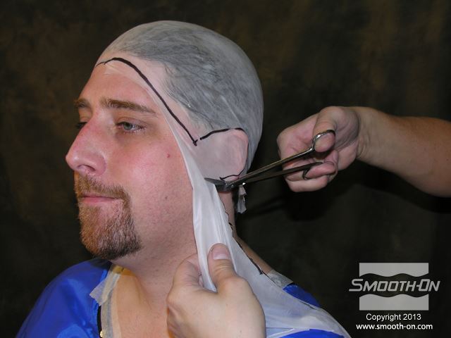 מכינים מעיל תמיכה הבנוי משני חצאים בעזרת תחבושות הגבס. הצעד הראשון הוא להכין את קו ההפרדה בין חצאי התבנית לאורך הנקודה הגבוהה בראש המודל.