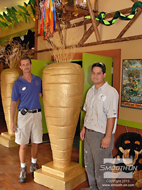 ריצ'ארד בוטורלה (שמאל) ופיטר ירקה (ימין) עומדים ליד פיסול קלקר מצופה Styrocoat של גזר זהב ענק - דוגמה נוספת למה שניתן להשיג בשימוש בפלסטיק לציפוי קצץ פוליסטירן Styrocoat.