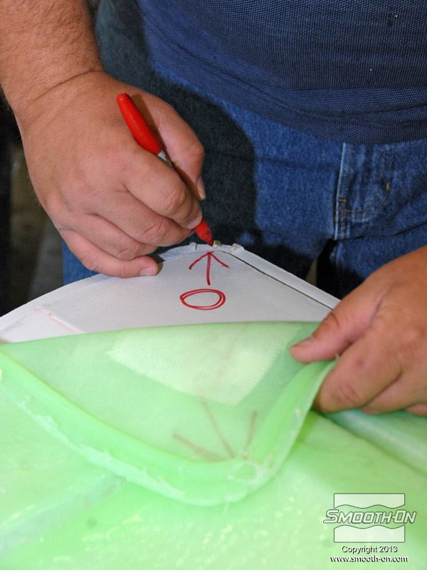 מציירים חץ אדום על התבנית ועל שקית הוואקום כדי שיהיה קל לזהות את מיקומה הנכון בעת הצבתה מחדש.