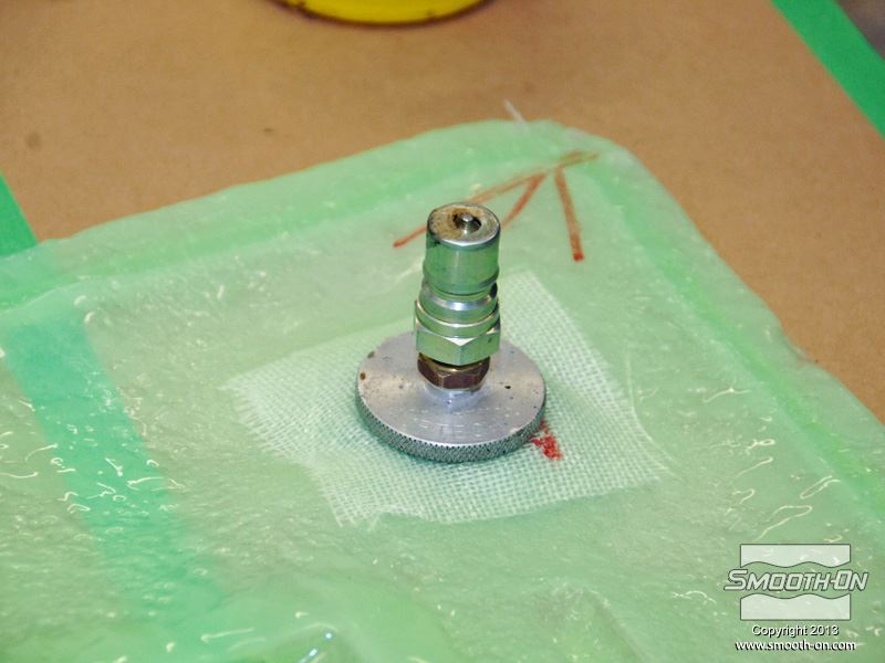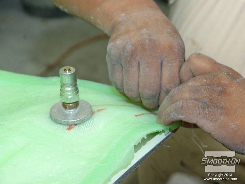מניחים חתיכה קטנה של אריג תמיכה על גבי הסיליקון כשהוא במצב דביק Tacky כדי לחזק את האזור שבו יהיה המחבר לפיית הואקום.