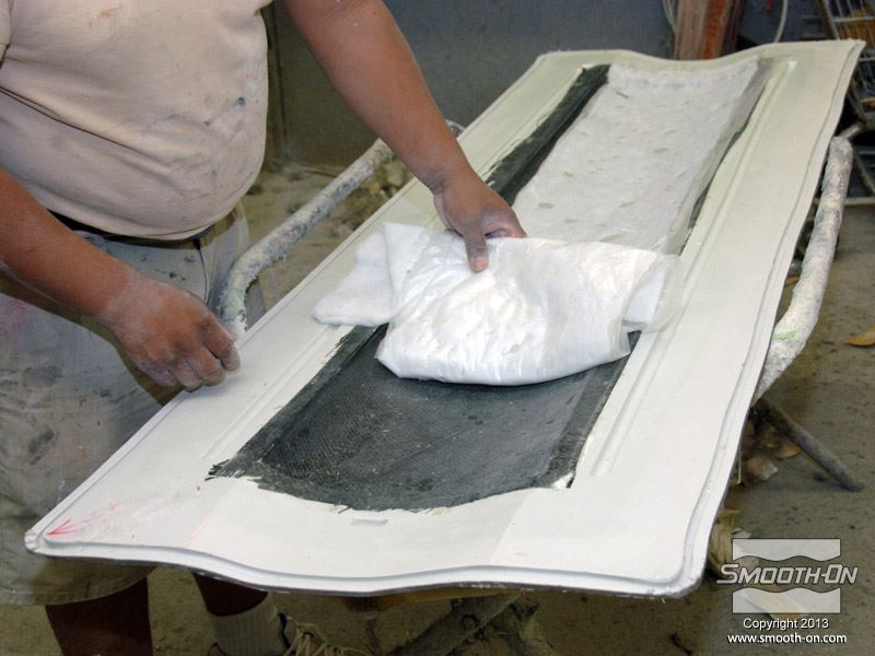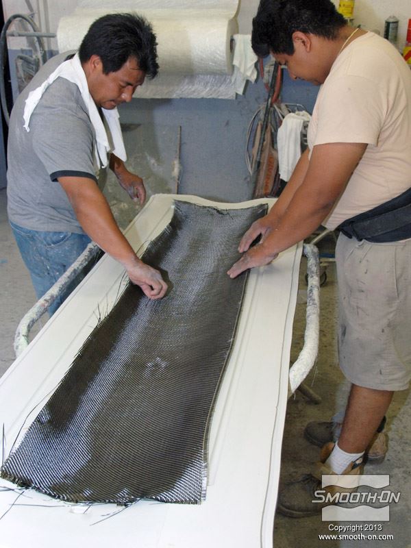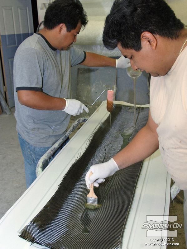 מניחים שכבות נוספות של בד קרבון בין השכבות מורחים שכבה נוספת של אפוקסי להספגה EpoxAmine בכל פעם.