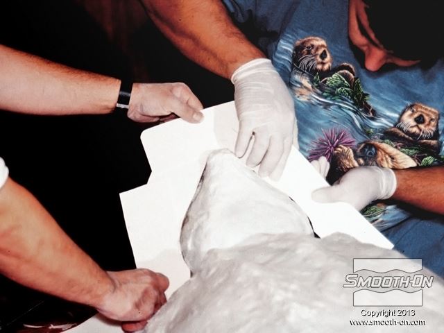 ממלאים את כל השקעים והחריצים במודל לגמרי בסיליקון להכנת תבנית Mold Max® 30. ניתן להשתמש בלחץ אוויר נמוך כדי לאלץ את הסיליקון להגיע לכל הפרטים העמוקים.