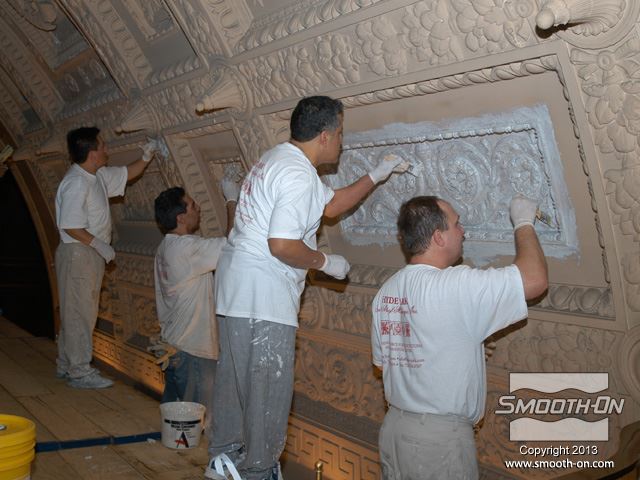שיחזור תקרת אולם נשפים בגובה 27.5 מטר במלון  The Regent Hotel במנהטן ניו יורק איכות עיטורי הטיח ההסטורי הדרדרו עם הזמן לפני בחירת התבנית נערכת בחינה דקדקנית של הקשת המיועדת לשיחזור על שטח השיחזור נמרח חומר אטימה super seal וחומר הפרדה Universal release. לאחר מכן נמרחה שכבה ראשונה של Brush-on 40. שיכבת המריחה הראשונה של פוליאוריטן Brush-on 40 היא דקה ביותר. את Brush-on 40 ניתן למרוח בשטח מאונך או אפילו על התקרה ללא נזילות. פיגמנט לפוליאוריטן SO-STRONG מתווסף לכל שיכבה של Brush-on 40. התוצאה: ניתן להבחין בין שכבת מריחה אחת לשניה ולדעת היכן יש חוסר בפוליאוריטן. תבליטים ארכיטקטונים יכולים להיות לעיתים מורכבים וקשים לשיחזור.  Brush-on 40 יעתיק בצורה מושלמת את התבליט המקורי גם אם הוא מורכב ביותר. עובד אחד מורח את ה Brush-On 40 ועובד שני מכין את השטח לפני המריחה של הפוליאוריטן. מומלץ למרוח 4 שכבות של פוליאוריטן בכדי להגיע לעובי מומלץ של 1 ס לאחר מריחת כל השכבות, יש להשאיר את הפוליאוריטן להתקשות בטמפ' החדר למשך לילה. יום למחרת מורחים שיכבת גיבוי קשיחה (מעיל) על גבי פוליאוריטן Brush-on 40 על מנת לתת תמיכה לגומי. בגמר הכנת התבנית מניחים את הפוליאוריטן בתוך מעיל הגיבוי והתבנית מוכנה ליציקה. החלקים שנוצקו בתבנית העשויים מגבס או מבטון שולבו בתקרה המקורית בצורה מושלמת. התוצאה: החלק הניזוק שופץ והוחלף בחלקים חדשים והפאר המקורי של המבנה חזר לקדמותו.