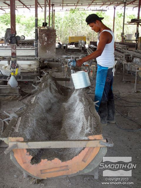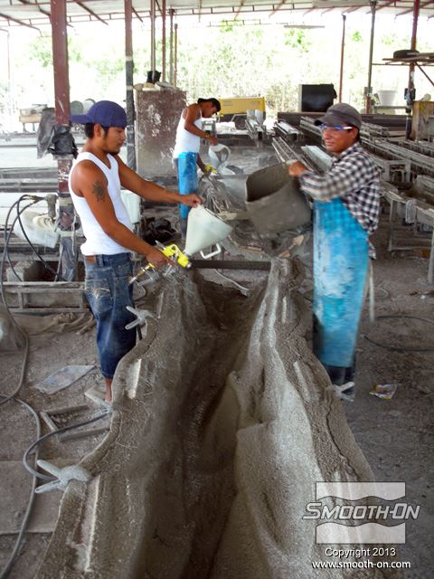 יציקת GFRC נעשית בשכבות, ראשית מתיזים שכבה בטון על התבנית.