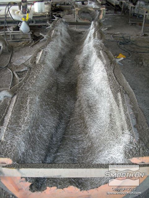סיבי זכוכית קצוצים מותזים על שיכבת הבטון הראשונית.
