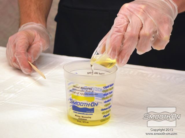 שכבת המילוי: מודדים כמויות שוות של הבסיס והמקשה של הSmooth-Cast® 325, לפי נפח.