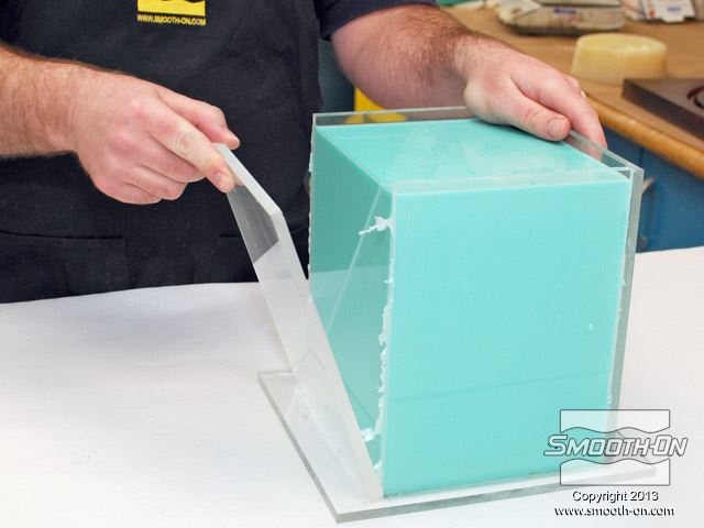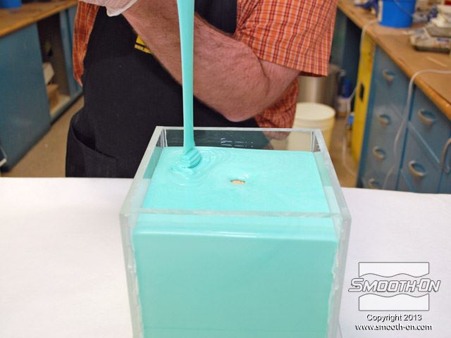 שופכים את סיליקון הMold Star® 15 לאט אל תוך אחת מפינות קופסת התבנית. מניחים לחומר לעלות בעצמו על המודל (במקום לשפוך ישירות על המודל) וכך נמנעים מלכידה של בועות אויר.